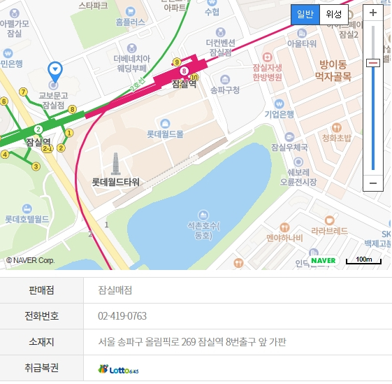 로또 명당 10위는 서울 송파구 올림픽로 269 잠실역 8번출구 앞 가판에 위치한 잠실매점입니다.