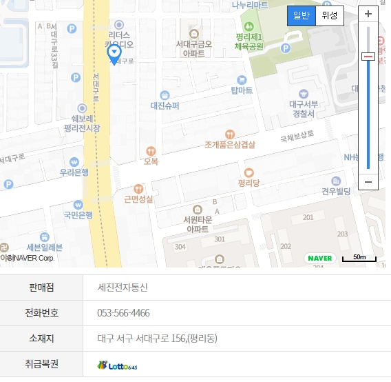 로또 명당 4위는 대구 서구 서대구로 156에 위치한 세진전자통신 입니다. 이 명당도 3위에 위치한 대구와 같은 도시네요. 저는 이런 명당인 곳들을 보면 기존에 주 업종이 무엇이였을지 명당으로 자리매김을 한 이후에도 그 업종을 유지하고 있는지 한번씩 궁금해집니다.