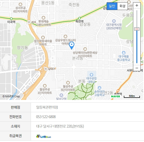 로또 명당 3위는 대구 달서구 대명천로 220에 위치한 일등복권 편의점입니다. 집앞에 이런 로또 명당 편의점이 있으면 정말 좋을뻔 했네요.