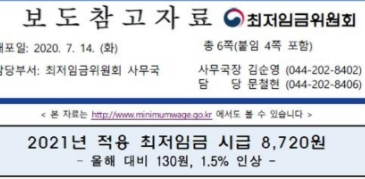 2020년 8월 5일 고용노동부 장관이 2021년의 최저시급은 8,720원 이라고 고시하였습니다. 2020년도 최저시급인 8.590원 보다 2021년도 최저시급은 130원이 올랐고 역대 최저 금액으로 인상되었습니다.