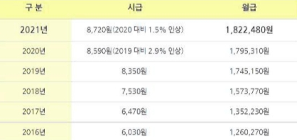 2021년도 최저시급은 8,720원, 주 5일기준 최저임금의 월급은 1,822,480원이며, 연봉은 21,869,760원 입니다. 시급 자체가 작년대비 많이 오르지 않아 월급도 연봉도 체감사 크게 와 닿는 수치는 아닙니다.